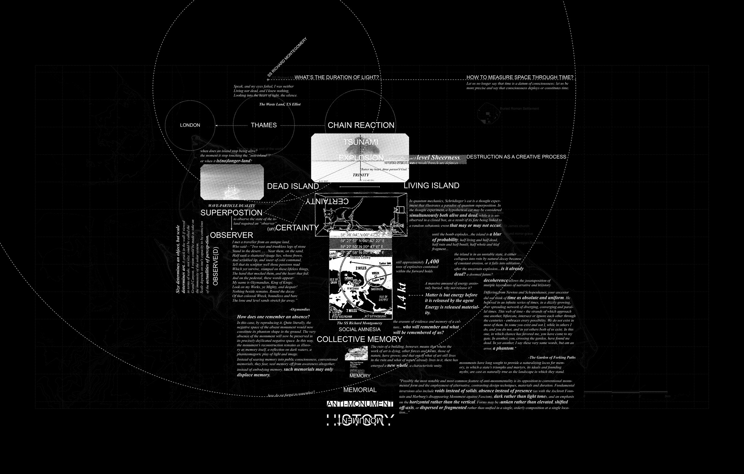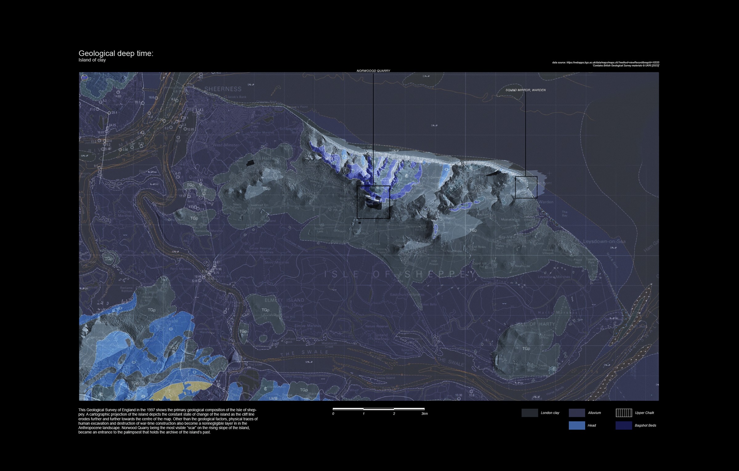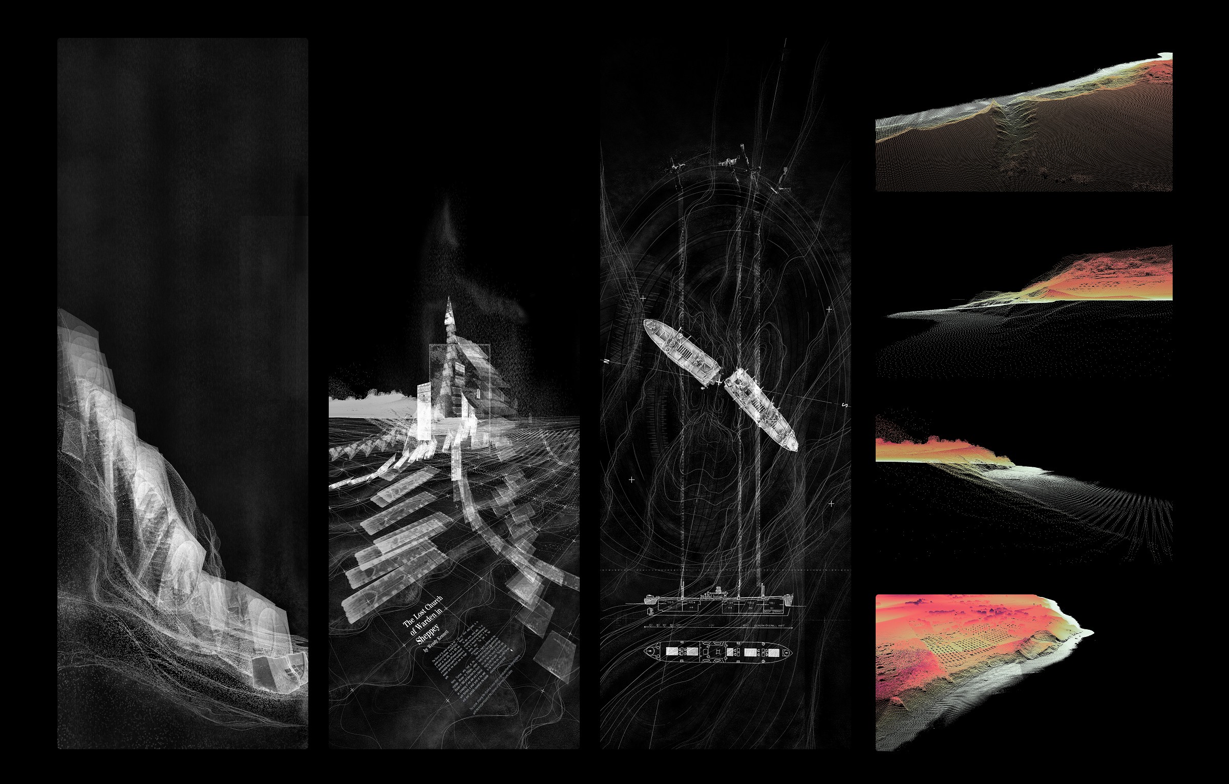 Gravity of Time treats architecture as a temporal sequence scripted through landscape, erosion, and film. Using cinematic reconstruction and digital terrain analysis tools such as Houdini and QGIS, the project examines an island as both a fictional construct and a physical reality. A shipwreck acts as a catalyst, redirecting currents and sediment so the coastline becomes an active instrument rather than a static boundary. Drawings, simulations, and a film trace how matter is displaced, deposited, and eroded over time, proposing an 'island museum' that only materialises when environmental change causes the movement or accumulation of matter.